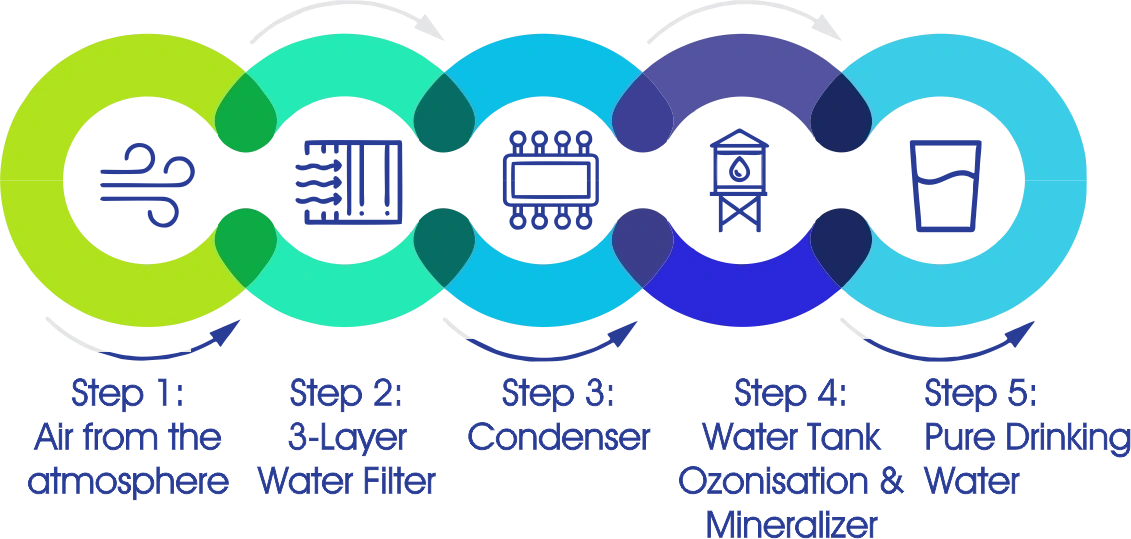 Once the air is filtered through a patented air filter process, a condensation unit receives the humid airflow from the evaporator. The condensation unit then converts the vapour (humidity) into water. This process is known as Atmospheric Condensation. Once the water is generated through this process, it is then purified via a 4 step filtration process.